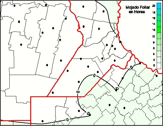 Mapa de humedad de hoja de las las últimas 0 horas.(Desde las 8:00AM hasta las 8:00AM). Se actualiza a las 10:00hs.