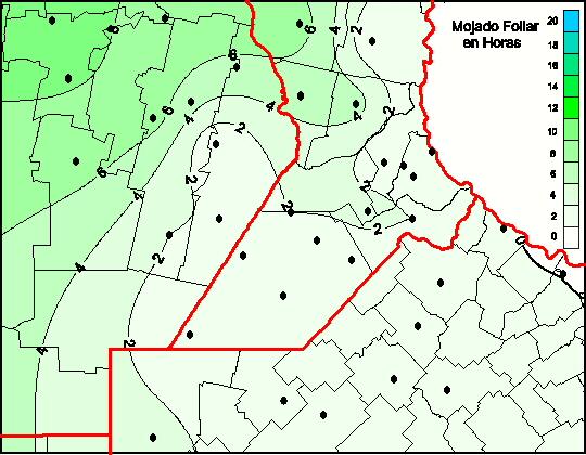 Mapa de humedad de hoja de las las últimas 0 horas.(Desde las 8:00AM hasta las 8:00AM). Se actualiza a las 10:00hs.