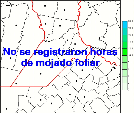 Mapa de humedad de hoja de las las últimas 0 horas.(Desde las 8:00AM hasta las 8:00AM). Se actualiza a las 10:00hs.