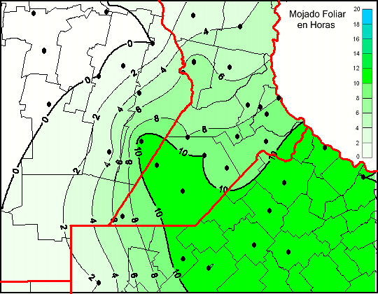 Mapa de humedad de hoja de las las últimas 48 horas.(Desde las 8:00AM hasta las 8:00AM). Se actualiza a las 10:00hs.