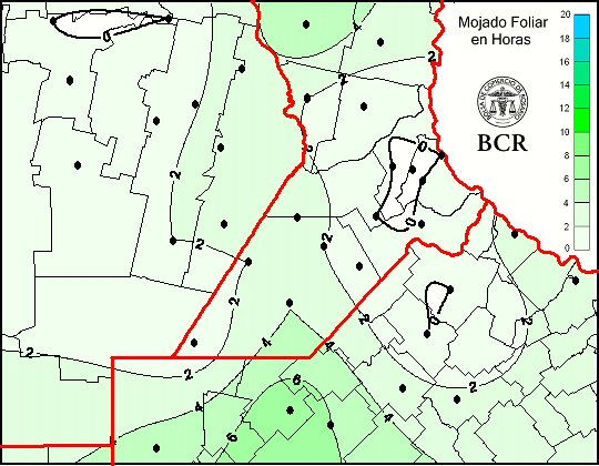 Mapa de cantidad de horas de mojado foliar en las últimas 24 horas.