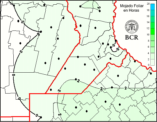 Mapa de cantidad de horas de mojado foliar en las últimas 24 horas.