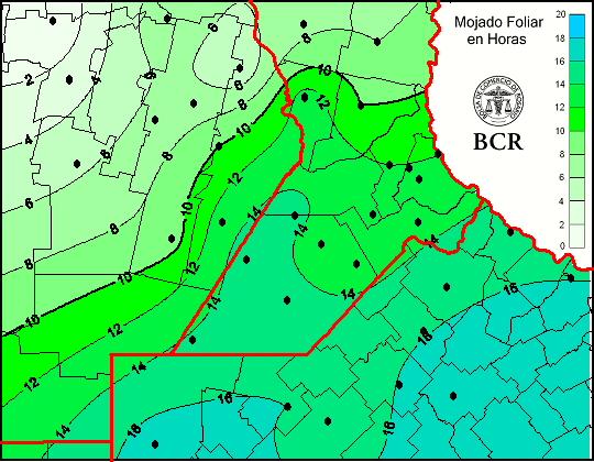 Mapa de cantidad de horas de mojado foliar en las últimas 24 horas.