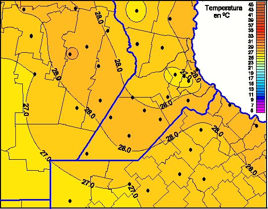 Mapa de temperaturas máximas de las las últimas 96 horas.(Desde las 8:00AM hasta las 8:00AM). Se actualiza a las 10:00hs.