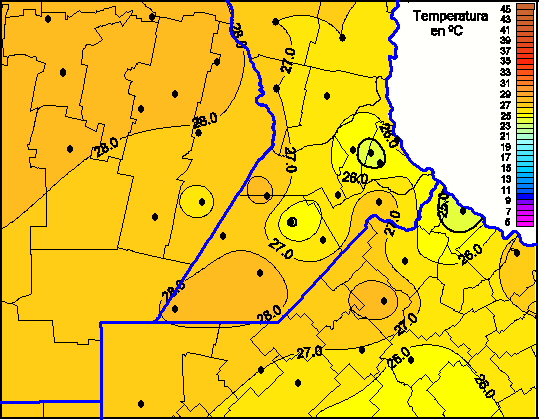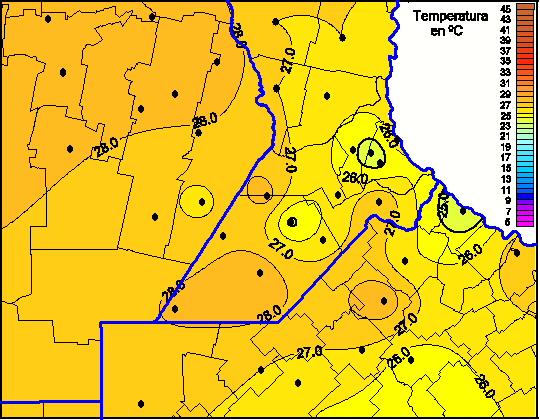 Mapa de temperaturas máximas de las las últimas 72 horas.(Desde las 8:00AM hasta las 8:00AM). Se actualiza a las 10:00hs.