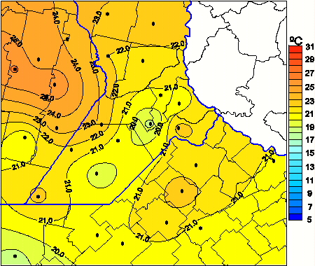 Mapa de temperaturas máximas de las las últimas 96 horas.(Desde las 8:00AM hasta las 8:00AM). Se actualiza a las 10:00hs.