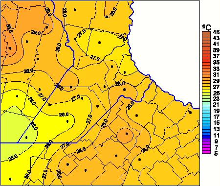 Mapa de temperaturas máximas de las las últimas 72 horas.(Desde las 8:00AM hasta las 8:00AM). Se actualiza a las 10:00hs.