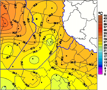 Mapa de temperaturas máximas de las las últimas 72 horas.(Desde las 8:00AM hasta las 8:00AM). Se actualiza a las 10:00hs.