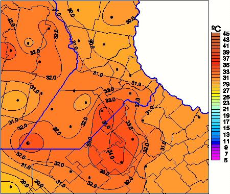 Mapa de temperaturas máximas de las las últimas 72 horas.(Desde las 8:00AM hasta las 8:00AM). Se actualiza a las 10:00hs.