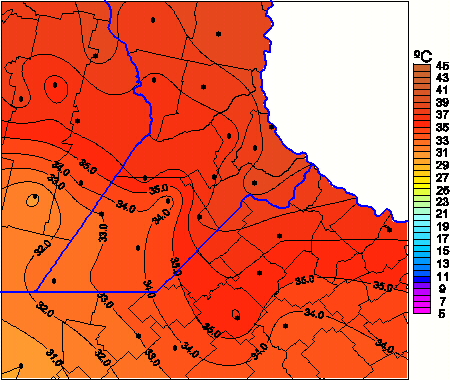 Mapa de temperaturas máximas de las las últimas 96 horas.(Desde las 8:00AM hasta las 8:00AM). Se actualiza a las 10:00hs.
