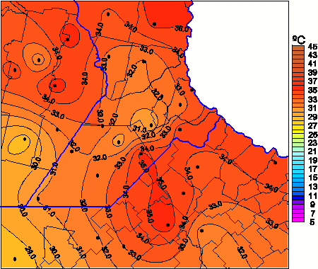 Mapa de temperaturas máximas de las las últimas 72 horas.(Desde las 8:00AM hasta las 8:00AM). Se actualiza a las 10:00hs.