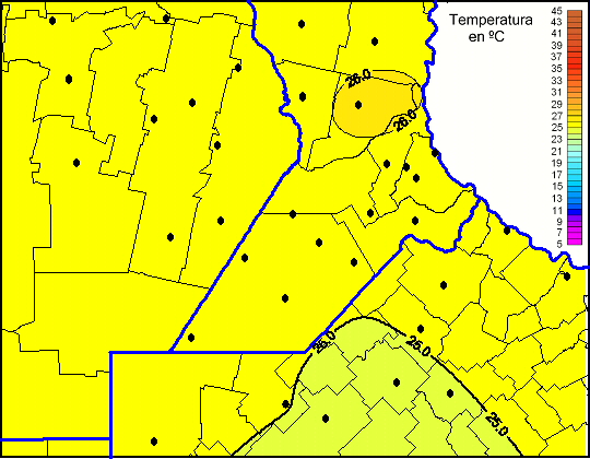 Mapa de temperaturas máximas de las las últimas 72 horas.(Desde las 8:00AM hasta las 8:00AM). Se actualiza a las 10:00hs.