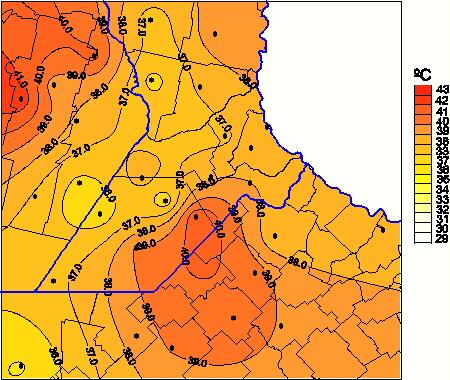 Mapa de temperaturas máximas de las las últimas 72 horas.(Desde las 8:00AM hasta las 8:00AM). Se actualiza a las 10:00hs.