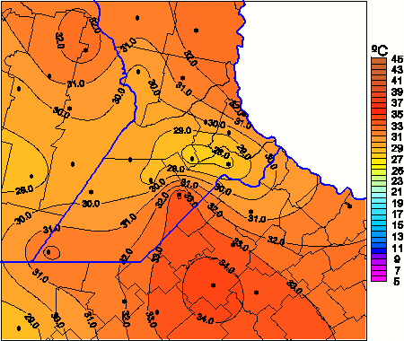 Mapa de temperaturas máximas de las las últimas 72 horas.(Desde las 8:00AM hasta las 8:00AM). Se actualiza a las 10:00hs.