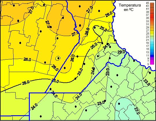 Mapa de temperaturas máximas de las las últimas 96 horas.(Desde las 8:00AM hasta las 8:00AM). Se actualiza a las 10:00hs.