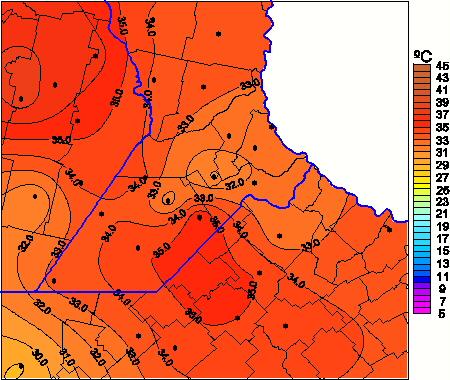 Mapa de temperaturas máximas de las las últimas 72 horas.(Desde las 8:00AM hasta las 8:00AM). Se actualiza a las 10:00hs.
