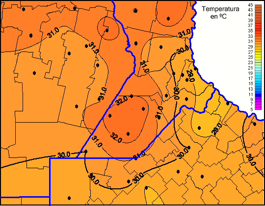 Mapa de temperaturas máximas de las las últimas 96 horas.(Desde las 8:00AM hasta las 8:00AM). Se actualiza a las 10:00hs.