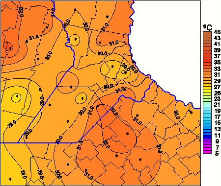Mapa de temperaturas máximas de las las últimas 72 horas.(Desde las 8:00AM hasta las 8:00AM). Se actualiza a las 10:00hs.