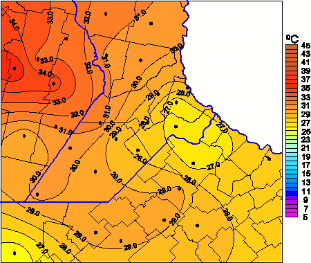 Mapa de temperaturas máximas de las las últimas 72 horas.(Desde las 8:00AM hasta las 8:00AM). Se actualiza a las 10:00hs.