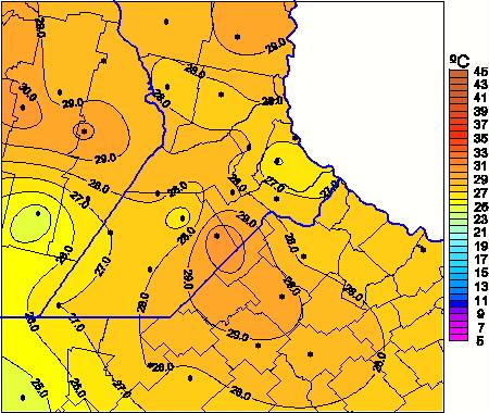 Mapa de temperaturas máximas de las las últimas 72 horas.(Desde las 8:00AM hasta las 8:00AM). Se actualiza a las 10:00hs.