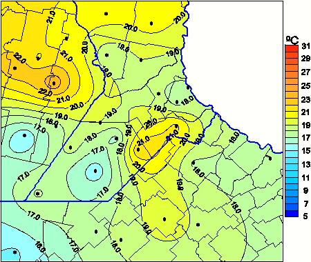 Mapa de temperaturas máximas de las las últimas 72 horas.(Desde las 8:00AM hasta las 8:00AM). Se actualiza a las 10:00hs.