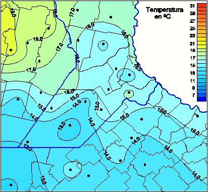 Mapa de temperaturas máximas de las las últimas 0 horas.(Desde las 8:00AM hasta las 8:00AM). Se actualiza a las 10:00hs.