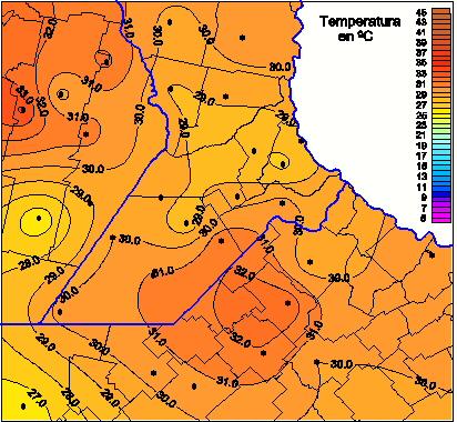 Mapa de temperaturas máximas de las las últimas 96 horas.(Desde las 8:00AM hasta las 8:00AM). Se actualiza a las 10:00hs.