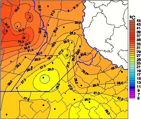 Mapa de temperaturas máximas de las las últimas 0 horas.(Desde las 8:00AM hasta las 8:00AM). Se actualiza a las 10:00hs.