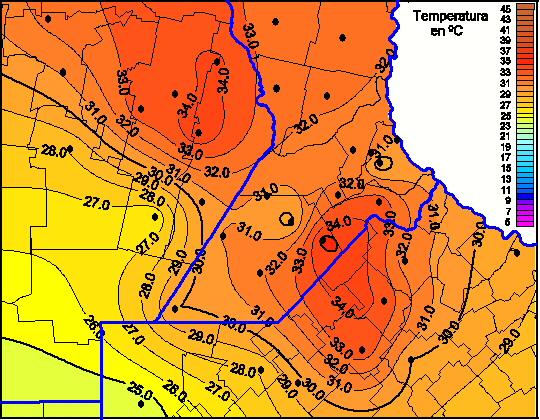Mapa de temperaturas máximas de las las últimas 72 horas.(Desde las 8:00AM hasta las 8:00AM). Se actualiza a las 10:00hs.