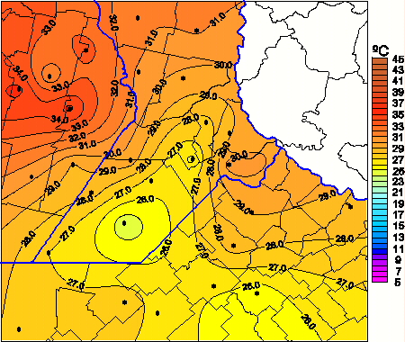 Mapa de temperaturas máximas de las las últimas 72 horas.(Desde las 8:00AM hasta las 8:00AM). Se actualiza a las 10:00hs.