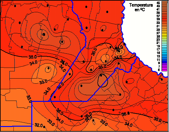 Mapa de temperaturas máximas de las las últimas 72 horas.(Desde las 8:00AM hasta las 8:00AM). Se actualiza a las 10:00hs.