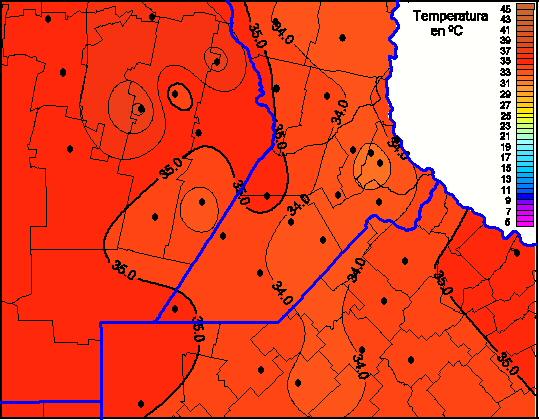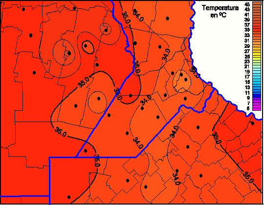 Mapa de temperaturas máximas de las las últimas 96 horas.(Desde las 8:00AM hasta las 8:00AM). Se actualiza a las 10:00hs.