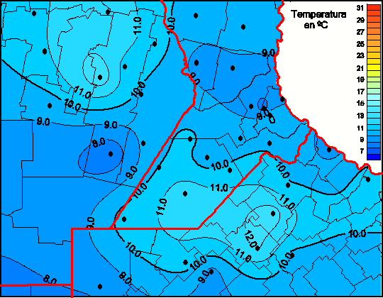 Mapa de temperaturas medias de las las últimas 48 horas.(Desde las 8:00AM hasta las 8:00AM). Se actualiza a las 10:00hs.