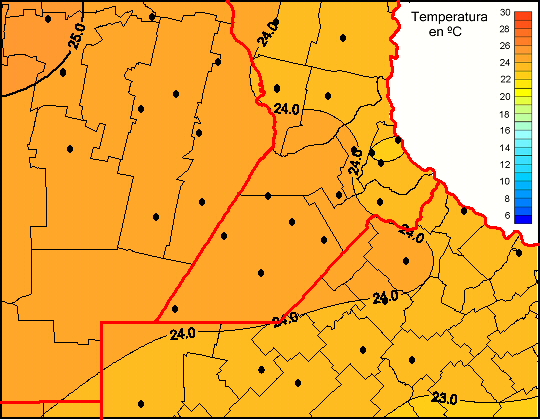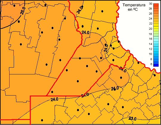Mapa de temperaturas medias de las las últimas 0 horas.(Desde las 8:00AM hasta las 8:00AM). Se actualiza a las 10:00hs.