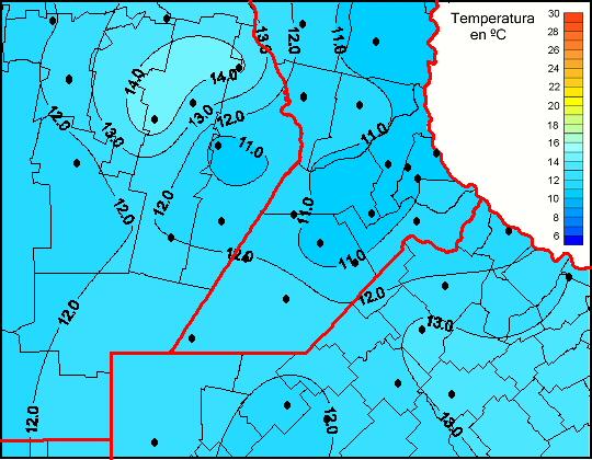 Mapa de temperaturas medias de las las últimas 48 horas.(Desde las 8:00AM hasta las 8:00AM). Se actualiza a las 10:00hs.