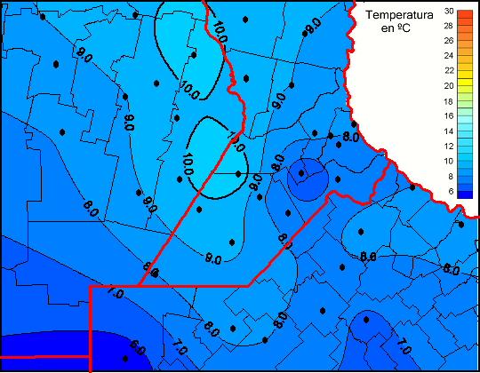 Mapa de temperaturas medias de las las últimas 192 horas.(Desde las 8:00AM hasta las 8:00AM). Se actualiza a las 10:00hs.