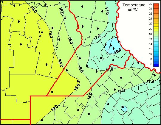 Mapa de temperaturas medias de las las últimas 96 horas.(Desde las 8:00AM hasta las 8:00AM). Se actualiza a las 10:00hs.