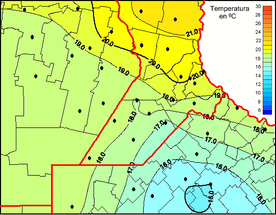 Mapa de temperaturas medias de las las últimas 48 horas.(Desde las 8:00AM hasta las 8:00AM). Se actualiza a las 10:00hs.