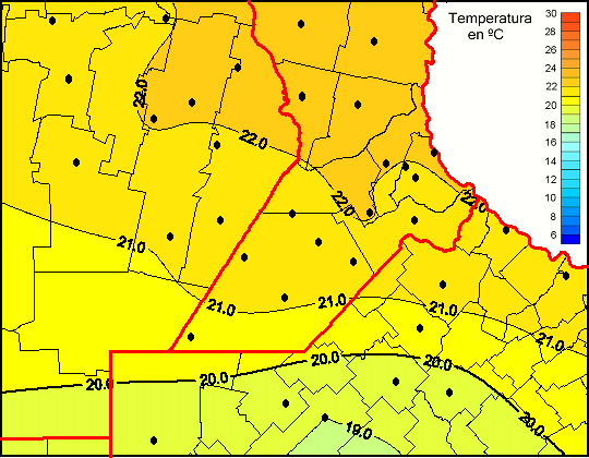 Mapa de temperaturas medias de las las últimas 144 horas.(Desde las 8:00AM hasta las 8:00AM). Se actualiza a las 10:00hs.