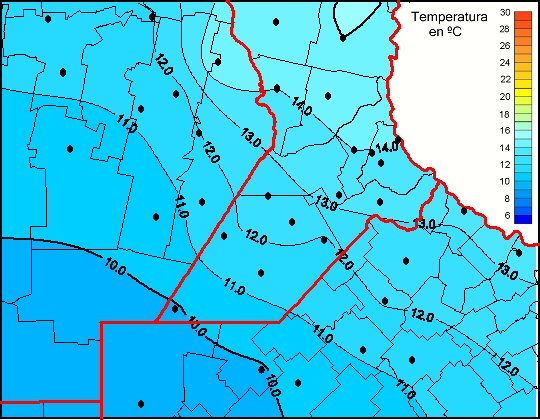Mapa de temperaturas medias de las las últimas 48 horas.(Desde las 8:00AM hasta las 8:00AM). Se actualiza a las 10:00hs.