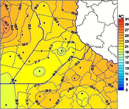 Mapa de temperaturas medias de las las últimas 0 horas.(Desde las 8:00AM hasta las 8:00AM). Se actualiza a las 10:00hs.