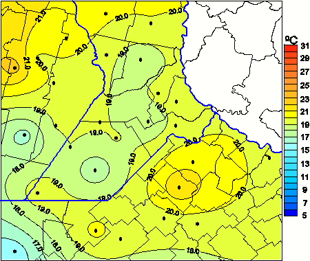Mapa de temperaturas medias de las las últimas 0 horas.(Desde las 8:00AM hasta las 8:00AM). Se actualiza a las 10:00hs.