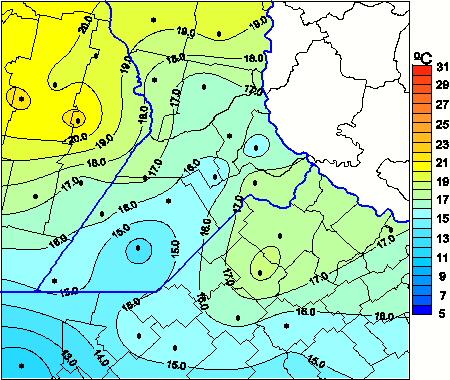 Mapa de temperaturas medias de las las últimas 72 horas.(Desde las 8:00AM hasta las 8:00AM). Se actualiza a las 10:00hs.