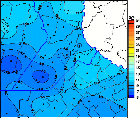 Mapa de temperaturas medias de las las últimas 48 horas.(Desde las 8:00AM hasta las 8:00AM). Se actualiza a las 10:00hs.