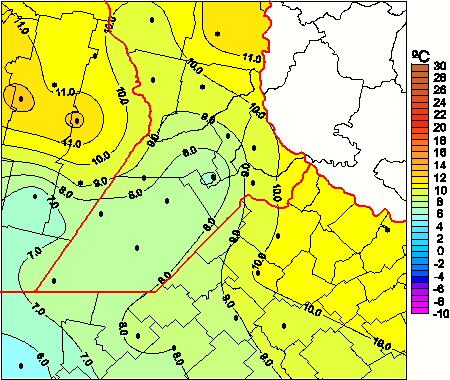 Mapa de temperaturas medias de las las últimas 48 horas.(Desde las 8:00AM hasta las 8:00AM). Se actualiza a las 10:00hs.