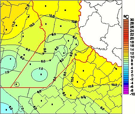 Mapa de temperaturas medias de las las últimas 96 horas.(Desde las 8:00AM hasta las 8:00AM). Se actualiza a las 10:00hs.