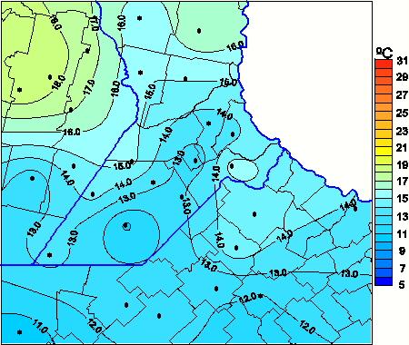 Mapa de temperaturas medias de las las últimas 48 horas.(Desde las 8:00AM hasta las 8:00AM). Se actualiza a las 10:00hs.