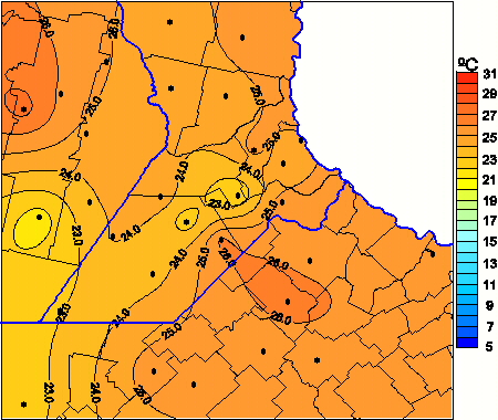 Mapa de temperaturas medias de las las últimas 72 horas.(Desde las 8:00AM hasta las 8:00AM). Se actualiza a las 10:00hs.
