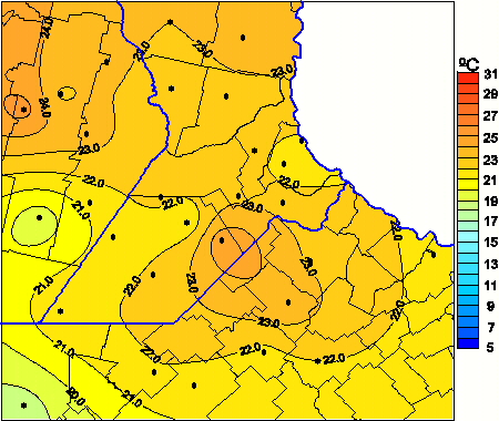 Mapa de temperaturas medias de las las últimas 72 horas.(Desde las 8:00AM hasta las 8:00AM). Se actualiza a las 10:00hs.