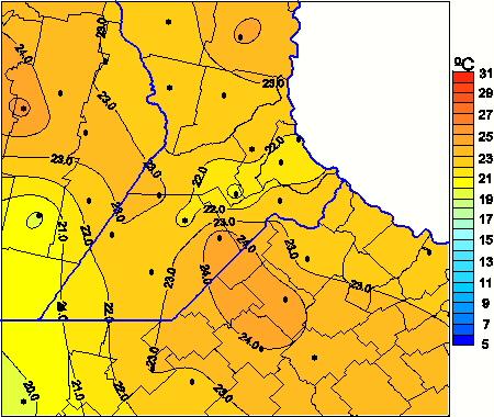 Mapa de temperaturas medias de las las últimas 48 horas.(Desde las 8:00AM hasta las 8:00AM). Se actualiza a las 10:00hs.
